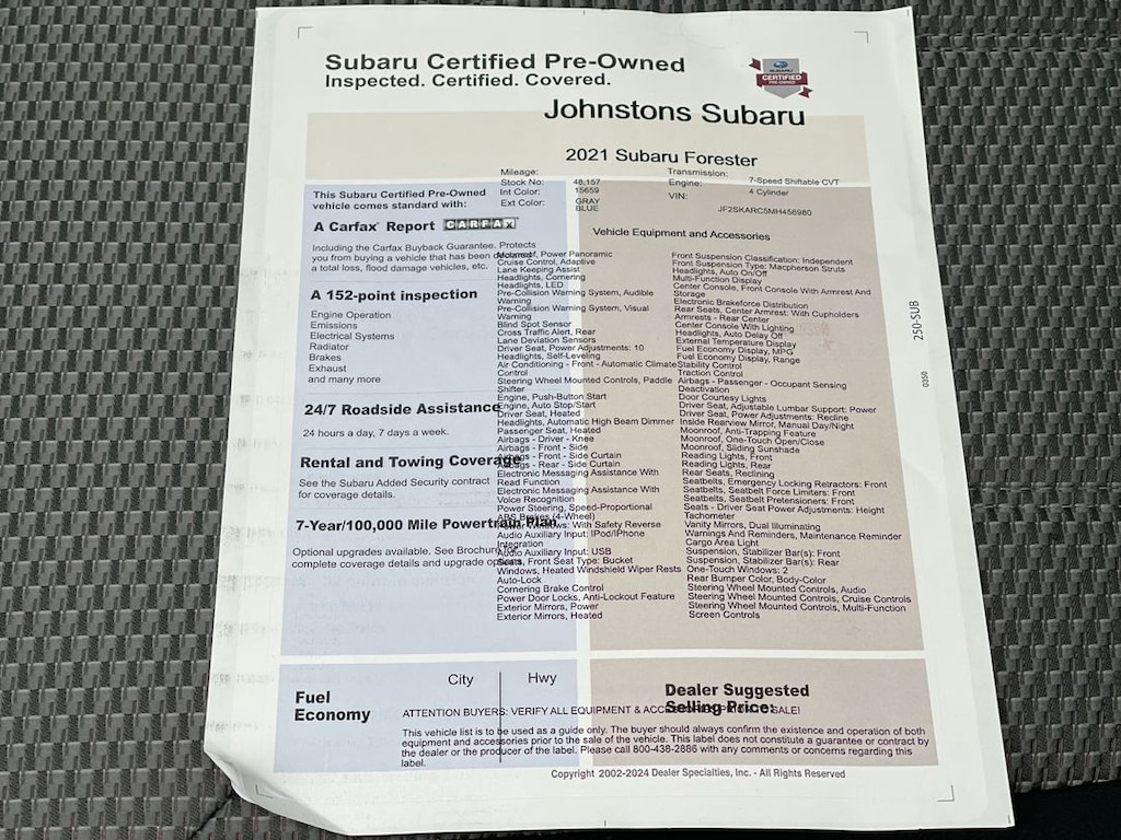 This vehicle is a 2021 Subaru Forester Sport with low mileage of 48,157 miles. It is an all wheel drive with a 2.5 liter 4 cylinder engine and fuel injection, and it has a fuel economy of 26 mpg in the city and 33 mpg on the highway. It has been given a crash test rating of 5 out of 5 stars, and it also comes with features such as blind spot sensor, hill start assist, and full time four wheel drive. This car is truly one of a kind and will surely turn heads wherever it goes! At Johnstons Subaru, our goal is to exceed your expectations at all times. The moment your walk into our showroom, which features the latest Subaru Impreza, Forester, Legacy, Outback and WRX models available, we intend to help you find a new or used car you'll love. Johnstons Subaru, located at 3480 Route 6 in Middletown, NY, is your premier retailer of new and used Subaru vehicles. Our dedicated sales staff and top-trained technicians are here to make your auto shopping experience fun.