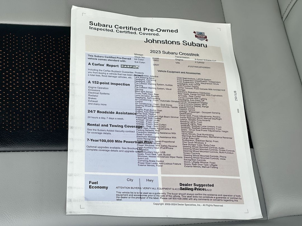 This vehicle is a 2023 Subaru Crosstrek Limited with an all-wheel drive system, fuel injected 2.5 liter 4 cylinder engine, and 24,826 miles driven. It has a crash test rating of 5 out of 5 stars and is equipped with features such as blind spot sensor, hill start assist, and full time four wheel drive. This car has an impressive fuel economy of 27 mpg in the city and 34 mpg on the highway, making it an efficient choice for any driver. It also has an impressive 5 out of 5 stars on crash test ratings, making it a safe and reliable option for anyone looking to purchase a car in 2023. At Johnstons Subaru, our goal is to exceed your expectations at all times. The moment your walk into our showroom, which features the latest Subaru Impreza, Forester, Legacy, Outback and WRX models available, we intend to help you find a new or used car you'll love. Johnstons Subaru, located at 3480 Route 6 in Middletown, NY, is your premier retailer of new and used Subaru vehicles. Our dedicated sales staff and top-trained technicians are here to make your auto shopping experience fun.