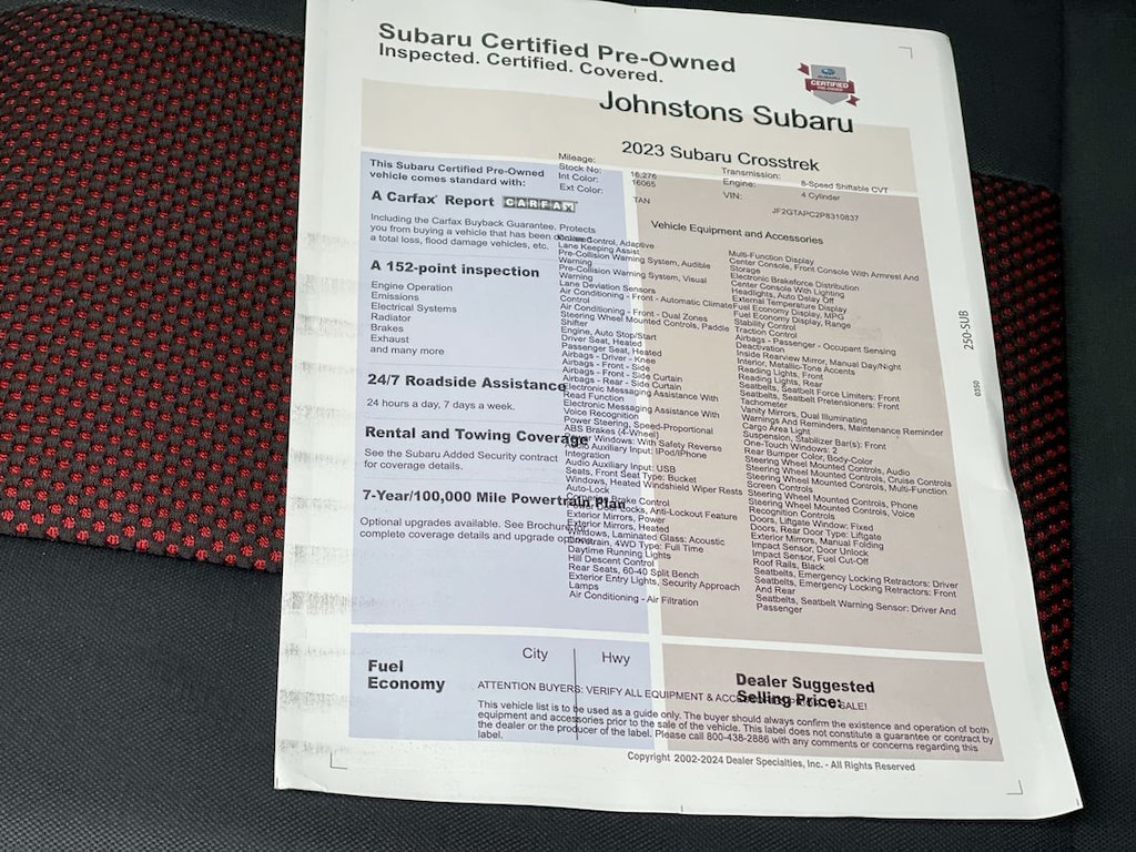 This vehicle is a 2023 Subaru Crosstrek Crossover all wheel drive with 16,289 miles. It is powered by a 2.0 liter 4 cylinder engine with fuel injection and features Hill Start Assist and Full Time Four Wheel Drive. This car has an impressive fuel economy of 28 mpg in the city and 33 mpg on the highway, making it an efficient choice for any driver. The car also comes with a host of features such as Hill Start Assist, and Full Time Four Wheel Drive that make it an ideal choice for any driver looking for a reliable and safe ride. At Johnstons Subaru, our goal is to exceed your expectations at all times. The moment your walk into our showroom, which features the latest Subaru Impreza, Forester, Legacy, Outback and WRX models available, we intend to help you find a new or used car you'll love. Johnstons Subaru, located at 3480 Route 6 in Middletown, NY, is your premier retailer of new and used Subaru vehicles. Our dedicated sales staff and top-trained technicians are here to make your auto shopping experience fun.