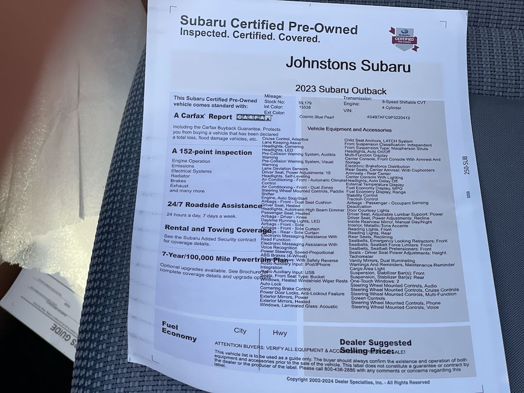 This vehicle is a 2023 Subaru Outback Premium Crossover, with an all wheel drive, 2.5 liter 4 cylinder engine, and fuel injected. It has driven 59,179 miles and has a crash test rating of 5 out of 5 stars. It has impressive fuel economy of 26 mpg in the city and 32 mpg on the highway, making it an efficient choice for those looking to save money on gas. It also features hill start assist and full time four wheel drive for added safety and control. This vehicle is sure to turn heads with its sleek design and modern features. At Johnstons Subaru, our goal is to exceed your expectations at all times. The moment your walk into our showroom, which features the latest Subaru Impreza, Forester, Legacy, Outback and WRX models available, we intend to help you find a new or used car you'll love. Johnstons Subaru, located at 3480 Route 6 in Middletown, NY, is your premier retailer of new and used Subaru vehicles. Our dedicated sales staff and top-trained technicians are here to make your auto shopping experience fun.