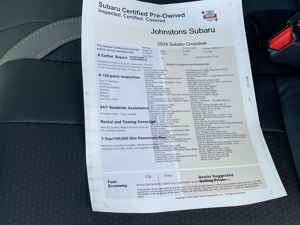This vehicle is a 2024 Subaru Crosstrek Wilderness, an all-wheel drive with a low mileage of 8,688 miles. It is powered by a 2.5 liter 4 cylinder engine with fuel injection and features a fuel economy of 25 mpg in the city and 29 mpg on the highway. The vehicle also comes with blind spot sensor, hill start assist, and full time four wheel drive for added safety and security. This car is sure to turn heads with its sleek design and modern features. At Johnstons Subaru, our goal is to exceed your expectations at all times. The moment your walk into our showroom, which features the latest Subaru Impreza, Forester, Legacy, Outback and WRX models available, we intend to help you find a new or used car you'll love. Johnstons Subaru, located at 3480 Route 6 in Middletown, NY, is your premier retailer of new and used Subaru vehicles. Our dedicated sales staff and top-trained technicians are here to make your auto shopping experience fun.