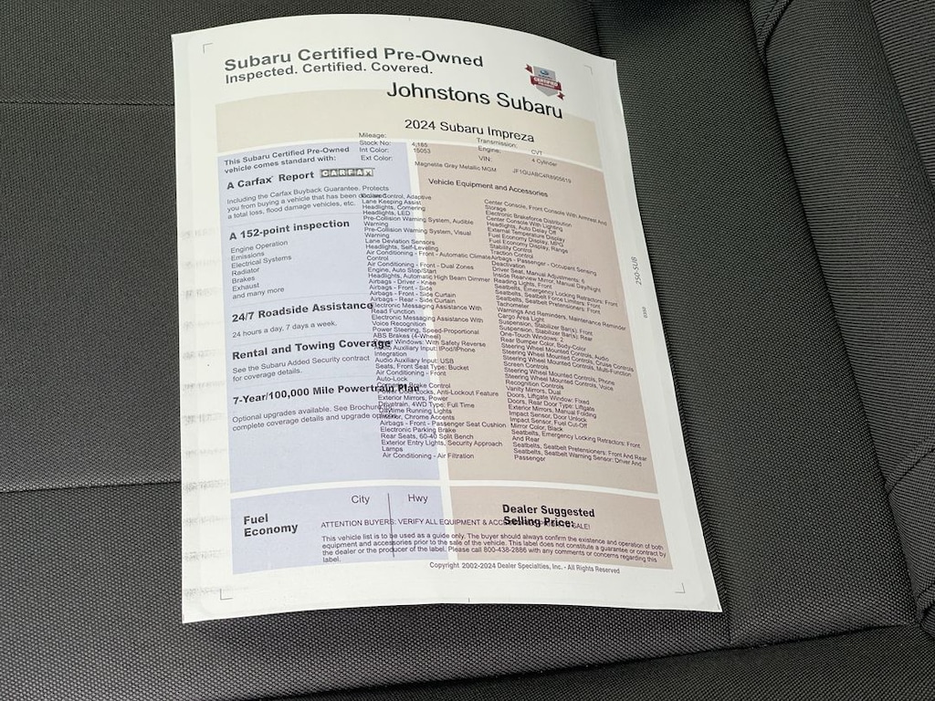 This vehicle is a 2024 Subaru Impreza Base Wagon, made with all wheel drive and a 2.0 liter 4 cylinder engine that is fuel injected. It has low mileage of 4,185 miles and a fuel economy of 27 mpg in the city and 34 mpg on the highway. It has a crash test rating of 5 out of 5 stars and comes with features such as hill start assist and full time four wheel drive. This car is sure to make your driving experience safe and enjoyable with its low price and high safety rating. At Johnstons Subaru, our goal is to exceed your expectations at all times. The moment your walk into our showroom, which features the latest Subaru Impreza, Forester, Legacy, Outback and WRX models available, we intend to help you find a new or used car you'll love. Johnstons Subaru, located at 3480 Route 6 in Middletown, NY, is your premier retailer of new and used Subaru vehicles. Our dedicated sales staff and top-trained technicians are here to make your auto shopping experience fun.