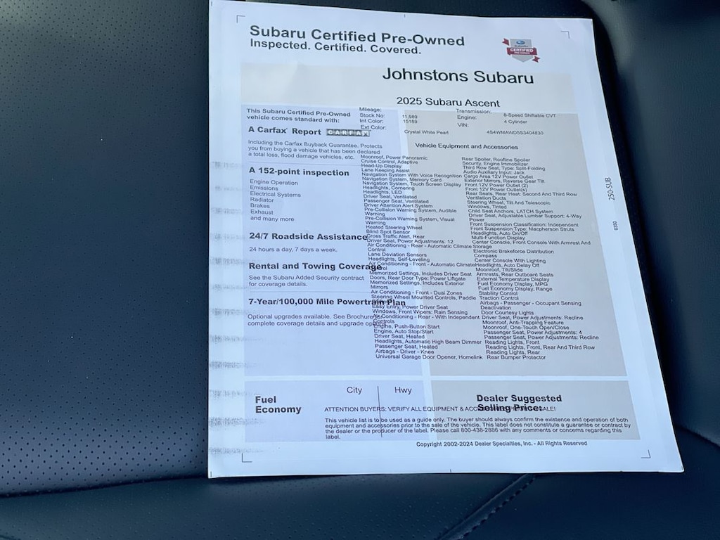 This vehicle is a 2025 Subaru Ascent SUV all wheel drive, with a 2.4 liter 4 cylinder engine and turbocharged power. It has driven 11,989 miles and boasts a fuel economy of 19 mpg in the city and 25 mpg on the highway. It has been awarded a 5 out of 5 star crash test rating and features such as blind spot sensor, hill start assist, full time four wheel drive, navigation system with voice recognition, and navigation with touch screen display. This car is truly one of a kind and will surely turn heads on the road. At Johnstons Subaru, our goal is to exceed your expectations at all times. The moment your walk into our showroom, which features the latest Subaru Impreza, Forester, Legacy, Outback and WRX models available, we intend to help you find a new or used car you'll love. Johnstons Subaru, located at 3480 Route 6 in Middletown, NY, is your premier retailer of new and used Subaru vehicles. Our dedicated sales staff and top-trained technicians are here to make your auto shopping experience fun.