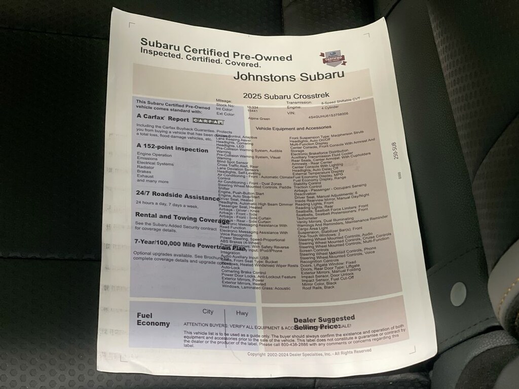 The 2025 Subaru Crosstrek Wilderness is a vehicle that is sure to turn heads. With its all wheel drive, 2.5 liter 4 cylinder engine, and fuel injection, this car is built for performance. It has already been driven 10,334 miles and has a fuel economy of 25 mpg in the city and 29 mpg on the highway. The car also comes with a number of features such as blind spot sensor, hill start assist, and full time four wheel drive to make your driving experience as safe and comfortable as possible. Whether you're looking for a reliable car for your daily commute or an adventurous ride for your weekend getaways, the 2025 Subaru Crosstrek Wilderness is the perfect choice. At Johnstons Subaru, our goal is to exceed your expectations at all times. The moment your walk into our showroom, which features the latest Subaru Impreza, Forester, Legacy, Outback and WRX models available, we intend to help you find a new or used car you'll love. Johnstons Subaru, located at 3480 Route 6 in Middletown, NY, is your premier retailer of new and used Subaru vehicles. Our dedicated sales staff and top-trained technicians are here to make your auto shopping experience fun.