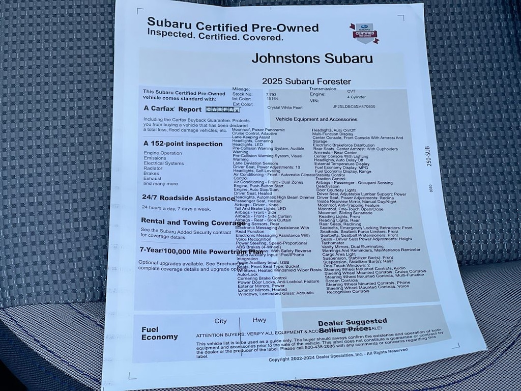 This vehicle is a 2025 Subaru Forester Crossover all wheel drive, with low mileage of 7,793 miles. It has a 2.5 liter 4 cylinder engine with fuel injection and an impressive fuel economy of 26 mpg in the city and 33 mpg on the highway. It has been crash tested for safety and received a 5 out of 5 stars rating on its crash test rating. It also comes with Hill Start Assist and Full Time Four Wheel Drive as standard features. This car is truly one of the most advanced vehicles on the market today. At Johnstons Subaru, our goal is to exceed your expectations at all times. The moment your walk into our showroom, which features the latest Subaru Impreza, Forester, Legacy, Outback and WRX models available, we intend to help you find a new or used car you'll love. Johnstons Subaru, located at 3480 Route 6 in Middletown, NY, is your premier retailer of new and used Subaru vehicles. Our dedicated sales staff and top-trained technicians are here to make your auto shopping experience fun.