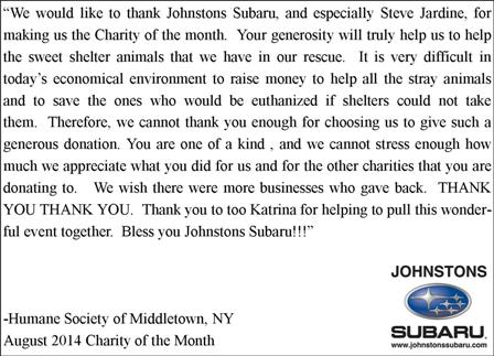 For August, Johnstons Subaru chose The Humane Society of Middletown as their Charity of the Month.Â