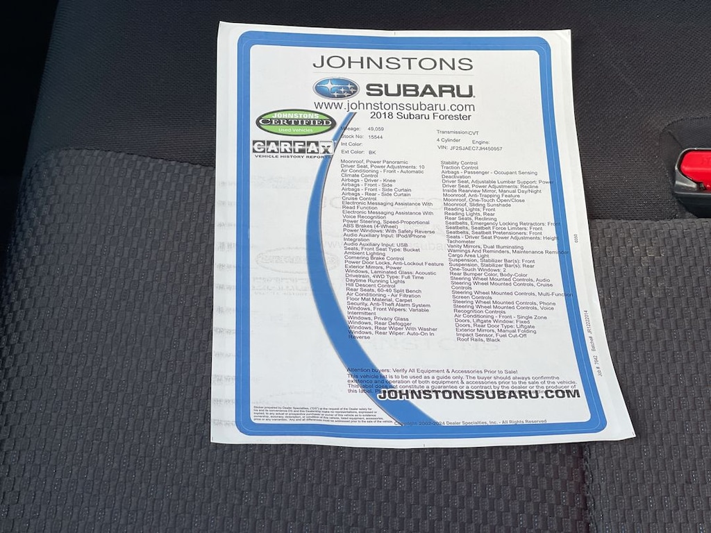 This vehicle is a 2018 Subaru Forester Crossover all wheel drive with low mileage of 49,059 miles. It has a 2.5 liter 4 cylinder engine with sequential port fuel injection and features Hill Start Assist and Full Time Four Wheel Drive. This car has an impressive fuel economy of 26 mpg in the city and 32 mpg on the highway, making it an ideal choice for those who want to save money on gas. It also comes with other great features such as a full time four wheel drive system and hill start assist that make driving this car even more enjoyable. At Johnstons Subaru, our goal is to exceed your expectations at all times. The moment your walk into our showroom, which features the latest Subaru Impreza, Forester, Legacy, Outback and WRX models available, we intend to help you find a new or used car you'll love. Johnstons Subaru, located at 3480 Route 6 in Middletown, NY, is your premier retailer of new and used Subaru vehicles. Our dedicated sales staff and top-trained technicians are here to make your auto shopping experience fun.
