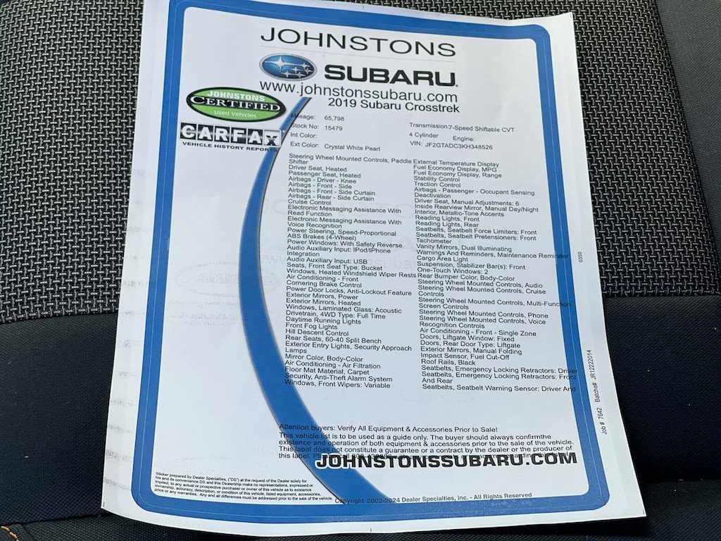 This vehicle is a 2019 Subaru Crosstrek Crossover all wheel drive with a 2.0 liter 4 cylinder engine and fuel injection. It has driven 65,798 miles and has a crash test rating of 5 out of 5 stars. This car has great fuel economy with 27 mpg in the city and 33 mpg on the highway. It also has hill start assist and full time four wheel drive for added safety and control. This car is also equipped with many great features such as Bluetooth connectivity, full screen navigation, and a rear view camera. With its impressive safety rating and great features, this car is sure to be a reliable and safe option for anyone looking for a reliable car in 2019. At Johnstons Subaru, our goal is to exceed your expectations at all times. The moment your walk into our showroom, which features the latest Subaru Impreza, Forester, Legacy, Outback and WRX models available, we intend to help you find a new or used car you'll love. Johnstons Subaru, located at 3480 Route 6 in Middletown, NY, is your premier retailer of new and used Subaru vehicles. Our dedicated sales staff and top-trained technicians are here to make your auto shopping experience fun.