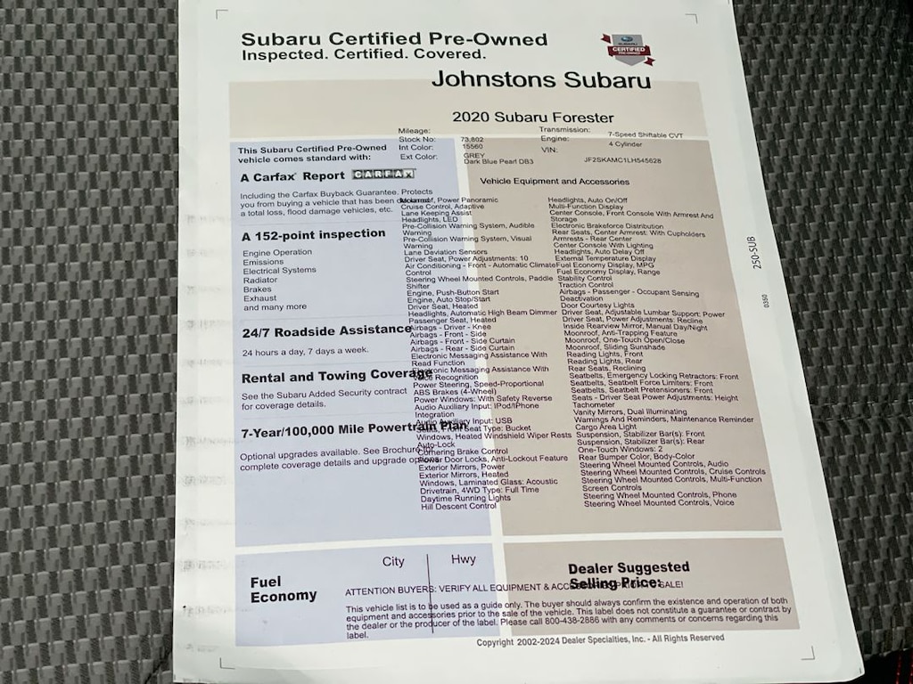 This vehicle is a 2020 Subaru Forester Sport with an all-wheel drive system, making it a reliable and powerful motorcar. It has a 2.5 liter 4 cylinder engine with fuel injection, and an impressive fuel economy of 26 mpg in the city and 33 mpg on the highway. It has been driven 73,802 miles and has received a crash test rating of 5 out of 5 stars. The vehicle also features hill start assist and full time four wheel drive for added safety and control. With its impressive performance and safety features, this car is sure to make any driver feel safe and secure on the roads. At Johnstons Subaru, our goal is to exceed your expectations at all times. The moment your walk into our showroom, which features the latest Subaru Impreza, Forester, Legacy, Outback and WRX models available, we intend to help you find a new or used car you'll love. Johnstons Subaru, located at 3480 Route 6 in Middletown, NY, is your premier retailer of new and used Subaru vehicles. Our dedicated sales staff and top-trained technicians are here to make your auto shopping experience fun.