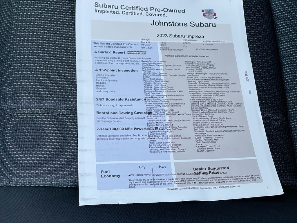 This vehicle is a 2023 Subaru Impreza Premium Sedan, all wheel drive, with a 2.0 liter 4 cylinder engine and fuel injection. It has driven 24,660 miles and has a crash test rating of 5 out of 5 stars. This car has impressive fuel economy with 28 mpg in the city and 36 mpg on the highway. It also has hill start assist and full time four wheel drive for added safety and control. This car is also equipped with many modern features such as Bluetooth connectivity, a rearview camera, and more. With its impressive safety rating and impressive performance, this car is sure to be a reliable and safe option for anyone looking for a reliable car. At Johnstons Subaru, our goal is to exceed your expectations at all times. The moment your walk into our showroom, which features the latest Subaru Impreza, Forester, Legacy, Outback and WRX models available, we intend to help you find a new or used car you'll love. Johnstons Subaru, located at 3480 Route 6 in Middletown, NY, is your premier retailer of new and used Subaru vehicles. Our dedicated sales staff and top-trained technicians are here to make your auto shopping experience fun.
