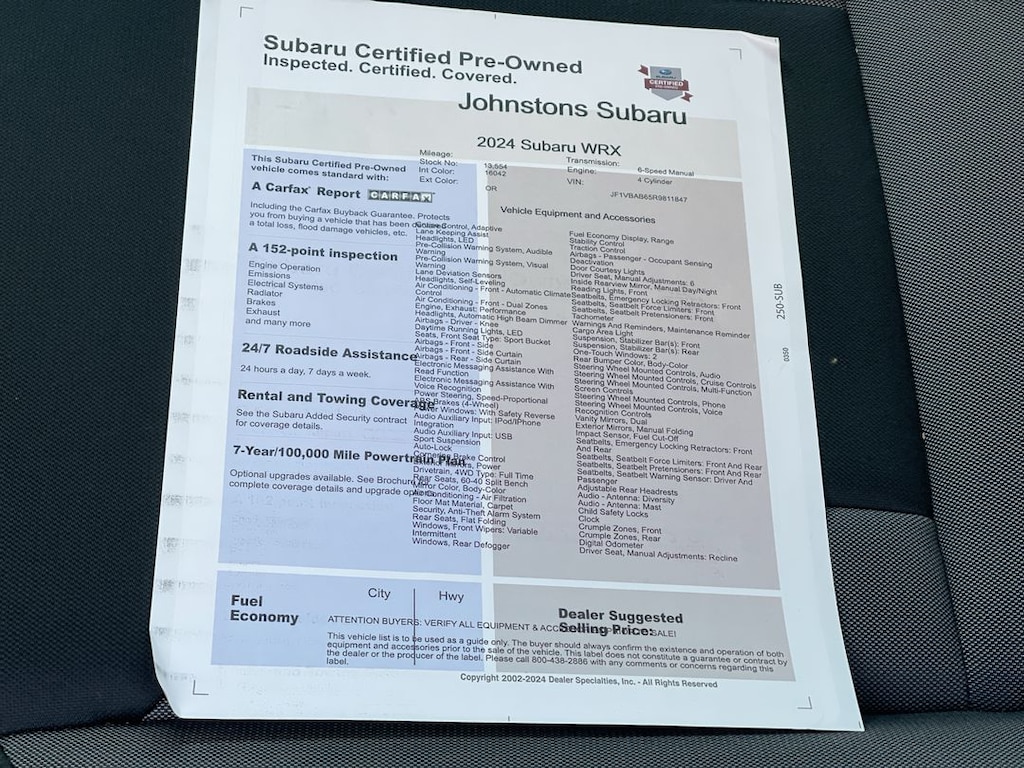 This vehicle is a 2024 Subaru Sedan WRX with low mileage of 13,554 miles. It is all wheel drive with a 2.4 liter 4 cylinder engine and turbocharged powertrain. It has an impressive fuel economy of 19 mpg in the city and 26 mpg on the highway, making it an efficient choice for any driver. The vehicle also has a crash test rating of 5 out of 5 stars, making it even safer. Additionally, this car comes with Hill Start Assist and Full Time Four Wheel Drive for added safety and control. With its impressive features and low mileage, this car is sure to be a reliable option for any driver looking for a reliable car in 2024. At Johnstons Subaru, our goal is to exceed your expectations at all times. The moment your walk into our showroom, which features the latest Subaru Impreza, Forester, Legacy, Outback and WRX models available, we intend to help you find a new or used car you'll love. Johnstons Subaru, located at 3480 Route 6 in Middletown, NY, is your premier retailer of new and used Subaru vehicles. Our dedicated sales staff and top-trained technicians are here to make your auto shopping experience fun.